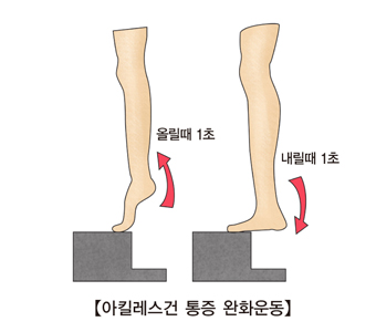 아킬레스건에 발생한 통증을 완화시키는 운동이 있습니다. 쉽고 보편적인 방법으로는 발꿈치를 올리고 내리는 방법으로, 계단이나 평지보다 15~20cm 높은 단 위에서 발 앞쪽 끝으로 서서 발꿈치를 들어 올린 뒤 발꿈치를 내려주는 운동입니다. 발꿈치를 올릴 때 1초, 발꿈치를 내릴 때 1초를 반복합니다.
