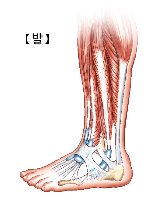 발은 뼈, 근육, 힘줄, 관절, 인대, 신경, 혈관들로 구성되어 있습니다.