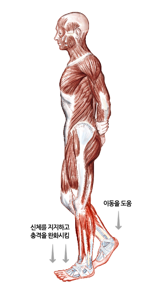 발은 총 19개의 근육과 힘줄을 가지고 있습니다. 다리와 발 동작은 전면근육, 측면근육, 후측표면근육, 후측심부근육의 운동에 의해 주로 이루어지게 됩니다. 힘줄은 뼈와 근육을 연결하는 부분입니다. 발에는 우리 몸 중에서 가장 큰 힘줄인 아킬레스건이 위치하고 있는데, 이는 이동에 중요한 역할을 담당합니다.