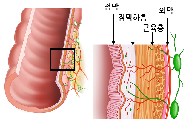 식도벽은 점막, 점막하층, 근육층, 외막으로 이루어져 있습니다. 식도의 1/3정도는 가로무늬근이며 아래쪽 2/3는 민무늬근으로 이루어져 있습니다.