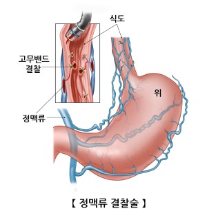 내시경을 통하여 출혈이 발생한 식도 정맥류를 관찰하고 출혈 부위의 정맥을 고무밴드를 이용해 꽈리 모양으로 묶어 줍니다. 그러면, 출혈이 멈추고 정맥류는 반흔성 변화를 보이면서 소실됩니다. 이 치료법은 효과가 높아 가장 많이 이용하는 방법입니다.