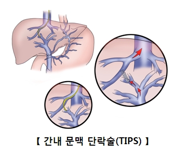 ⑤ 내시경적 치료로 출혈이 조절되지 않는다면, 경 경정맥 간내 문맥전신 단락술(transjugular intrahepatic portosysteomic shunt, TIPS)을 시행할 수 있습니다. 간 내에서 간정맥과 간문맥을 연결하는 통로를 만든 후, 이 통로를 넓히고 스텐트를 삽입하여 단락을 형성하는 치료법입니다. 이 치료는 스텐트가 막히거나 간성 혼수가 초래되는 부작용을 초래할 수 있습니다.