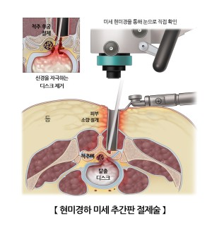 수술은 일반적으로 전신 마취 후 현미경 시야에서 최소 절개(약 2~3cm)하여 뼈(후궁판)에 조그만 구멍을 만들고, 이를 통하여 탈출한 추간판을 절제하는 방법으로 진행됩니다.
