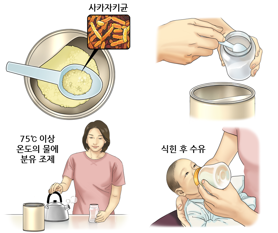 사카자키균은 대장균의 일종으로 열에 매우 취약합니다. 이 세균은 75℃에서 100% 파괴됩니다. 70℃에서는 세균의 개수가 10만 분의 1로 감소합니다. 따라서 사카자키균의 감염을 예방하기 위해서는 분유를 조제할 때 70℃ 이상의 온도의 물을 이용합니다. 한 번 먹이고 남은 분유는 보관하지 않고 버려야 합니다. 손을 깨끗이 씻은 후 분유를 조제해야 합니다. 젖병, 젖꼭지, 스푼 등도 깨끗이 씻고 살균 처리합니다. 선식을 이유식 대용으로 사용하는 경우에도 70℃ 이상의 물에 타는 것이 안전합니다.
