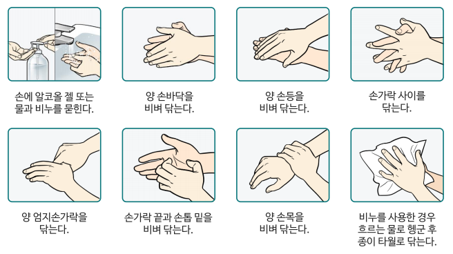 손은 대부분의 감염병을 옮기는 매개체이므로 철저한 손씻기가 가장 중요한 감염병 예방법입니다. 사람의 분비물은 직접 튀는 경우보다, 그 분비물이 어딘가에 묻었는데 손으로 만져서 몸으로 들어올 확률이 더 높다고 알려져 있습니다. 흐르는 물에 비누를 이용하여 30초 이상 손을 씻으면 바이러스는 거의 다 죽거나 힘이 약해져 감염을 일으키기 힘들다고 합니다.