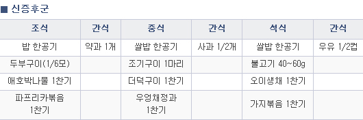 2. 식사양이 줄어 열량 섭취가 줄면 체조직이 분해되어 체중이 감소하므로 밥 1공기정도의 충분한 식사량을 유지합니다.